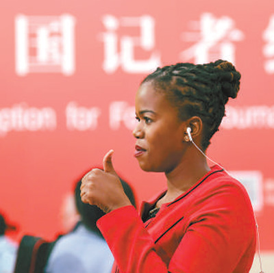 外國記者在十九大新聞中心進行現(xiàn)場連線報道。  本報記者 雷 聲攝