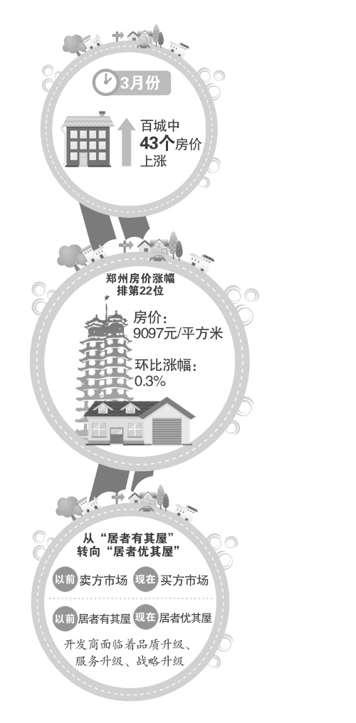 中國(guó)指數(shù)研究院昨日發(fā)布的百城房?jī)r(jià)指數(shù)顯示,3月份,100個(gè)城市中有43個(gè)房?jī)r(jià)上漲,全國(guó)房?jī)r(jià)環(huán)比整體跌幅收窄,微跌0.15%,同比跌幅繼續(xù)擴(kuò)大,下跌4.35%。其中,鄭州3月份新建商住房均價(jià)為9097元/平方米,環(huán)比上漲0.3%,漲幅在全國(guó)排到第22位。