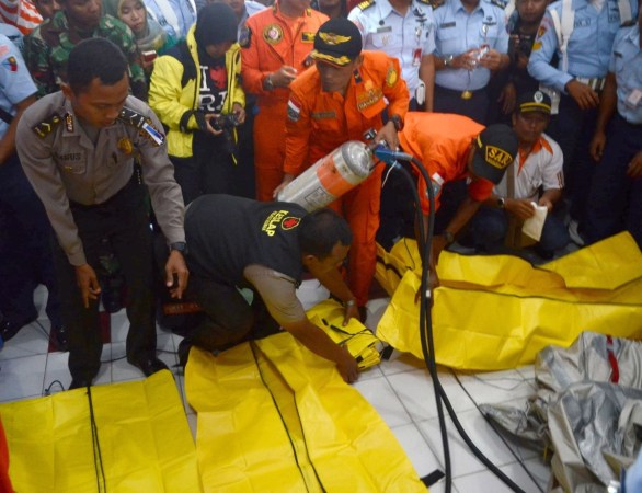 當?shù)貢r間2014年12月30日,印尼龐卡蘭布翁,印尼搜救部隊準備尸袋前往飛機失事地點打撈殘骸和遺體。