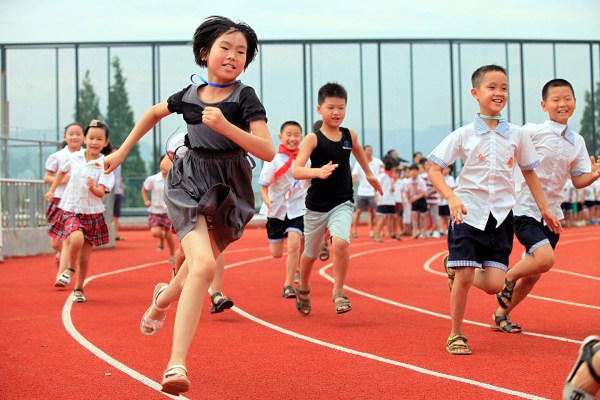 2014年9月1日,浙江省臺州市,天臺縣赤城街道第二小學(xué)的房頂環(huán)形跑道正式啟用,學(xué)生們首次在環(huán)形跑道上跑步玩耍。據(jù)了解,天臺縣赤城街道第二小學(xué)由于學(xué)校建設(shè)用地不足,該校在教學(xué)樓四樓頂設(shè)計了200米環(huán)形跑道,這一做法在全國尚屬首例。孫金標/CFP