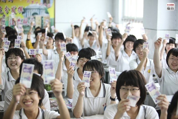 學(xué)校的另一項(xiàng)解壓措施是發(fā)放“回頭錢”,向每名學(xué)生發(fā)兩張五元紙幣,寓意“五谷豐登”、“十全十美”。圖為2012年6月3日,一位老師拿著一沓新紙幣準(zhǔn)備發(fā)給學(xué)生。