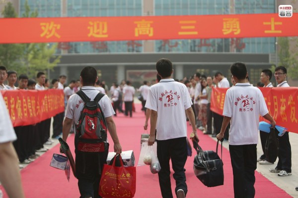 圖為2013年5月24日,衡水二中高三學(xué)生經(jīng)過(guò)短暫的休息返校,這次返校后他們下一次休息將是高考結(jié)束。歸校時(shí),他們被譽(yù)為“勇士”,所有高三班主任則站在門口兩側(cè)迎接學(xué)生歸來(lái)。