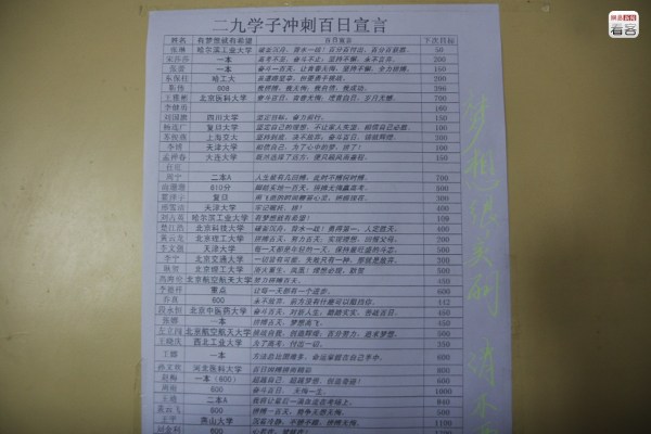 圖為2009年6月1日,墻上貼著學(xué)生們?cè)跊_刺百日時(shí)寫下的誓言,每個(gè)人的目標(biāo)不同,但都會(huì)盡量具體到一個(gè)學(xué)校甚至增加多少分?jǐn)?shù),也都會(huì)留下一個(gè)“宣言”激勵(lì)自己。