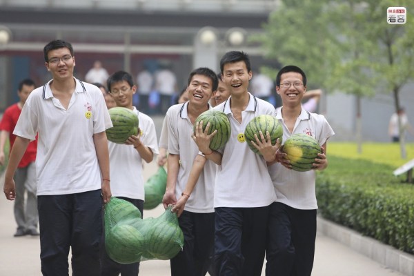 圖為2012年6月6日,學(xué)生們抱著學(xué)校發(fā)的西瓜,臨近高考,這種免費(fèi)福利不少。而高考前一天晚上的晚自習(xí),老師則會(huì)帶著學(xué)生們舉行一場(chǎng)“西瓜宴”