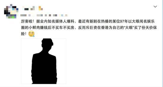 5月1日,某大號(hào)在社交平臺(tái)爆料稱(chēng):“厲害啦!據(jù)業(yè)內(nèi)知名媒體人爆料,最近有新劇在熱播的某位97年以大眼聞名娛樂(lè)圈的小鮮肉賺錢(qián)后不買(mǎi)車(chē)不買(mǎi)房,反而斥巨資在香港為自己的“大眼”買(mǎi)了份天價(jià)保險(xiǎn)!”