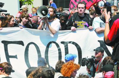 5月21日,一名“占領(lǐng)芝加哥”活動的抗議者在“要食物不要炸彈”的橫幅前發(fā)表反戰(zhàn)演講。當(dāng)日,近千名抗議者在美國總統(tǒng)奧巴馬的競選總部大樓外進(jìn)行示威活動,要求奧巴馬政府和北約立即停止戰(zhàn)爭。新華社記者 張保平攝