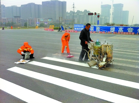 3月29日上午10時(shí)許,在金水東路與東風(fēng)東路交叉口,工人們正在對(duì)該路口的斑馬線重新噴漆(如圖)?!靶聵?biāo)線施劃完5分鐘即可通行”,現(xiàn)場(chǎng)的工人說。