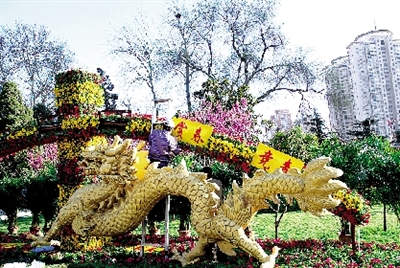 此次花展分別布置了“雙龍競(jìng)春”、“綠島探春”等5個(gè)立體和平面花壇,有配花如牽牛花、三色堇等兩萬(wàn)余盆,另有袖珍葉子、散尾葵、綠茉莉、夏威夷等近千盆點(diǎn)綴,其中景點(diǎn)“樂(lè)童嬉春”的“魔方”使用7000余枝鮮切花康乃馨制成。