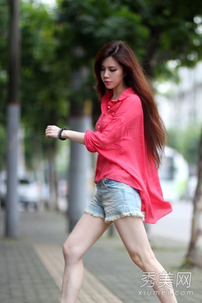 西瓜紅寬松襯衫,前短后長(zhǎng),寬松版型,盡顯歐美風(fēng)范兒。搭配牛仔短褲,清新迷人,大秀美腿,特別清爽有型哦。