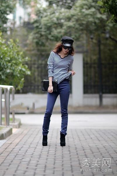 藍(lán)色條紋長(zhǎng)袖T恤搭配藍(lán)色鉛筆褲,喜歡藍(lán)色的女生可以學(xué)學(xué)這身搭配,比較簡(jiǎn)單但很有氣場(chǎng)。配上蓋帽和同色高跟鞋,挺有歐美風(fēng)格。