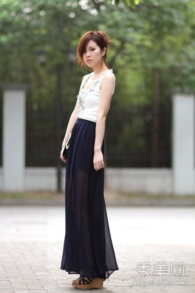 白色背心搭配黑色半身長(zhǎng)裙,還是透視感的款式,特別有T臺(tái)的感覺(jué)。簡(jiǎn)約的黑白配清新淡雅,散發(fā)著一種低調(diào)的時(shí)尚感。