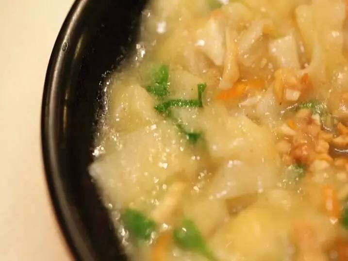 用勺子一攪就感受到了那黏糊勁兒,入口糊涂的香氣就散開(kāi)了。面條已經(jīng)被煮斷,但吃起來(lái)還有筋筋的感覺(jué)。軟軟的胡蘿卜絲和油炸豆腐絲、還有脆爽的青菜段和面面的黃豆,混在一起滾燙咸香,滋味很足。微辣的蒜油也添了幾分香氣,很有家的味道。