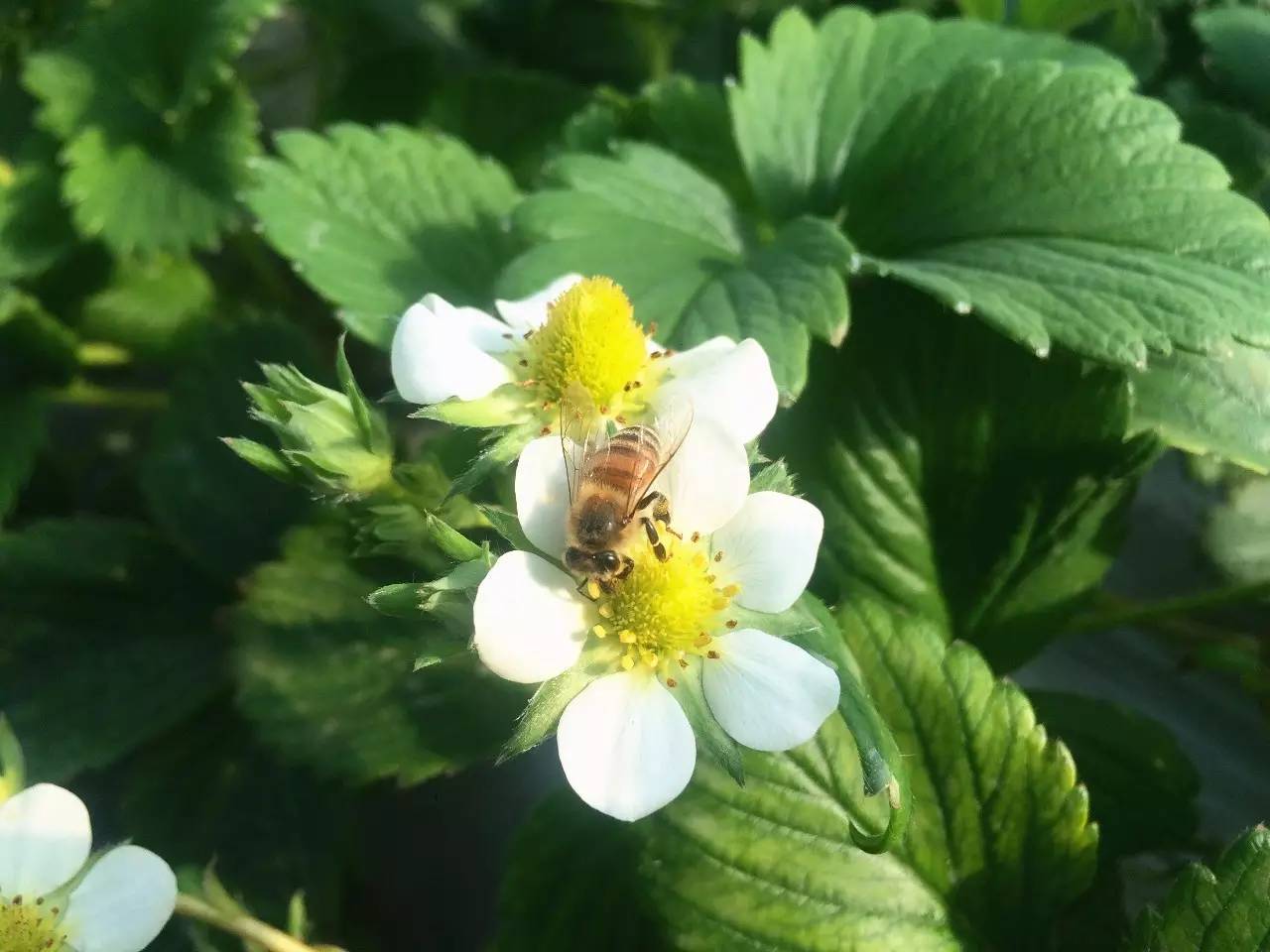 紅顏草莓是由優(yōu)質(zhì)草莓品種章姬和幸香雜交育成,它繼承了章姬的鮮甜和幸香的耐儲存,也因根基部顏色發(fā)紅得名。一進棚,就聽到陣陣的嗡嗡聲。潔白的草莓花上,小蜜蜂展著透明的翅膀正忙著采蜜。據(jù)說經(jīng)過蜜蜂授粉良好的花朵才能長出個頭飽滿勻稱的草莓。