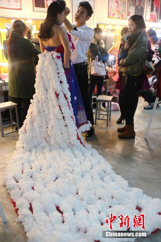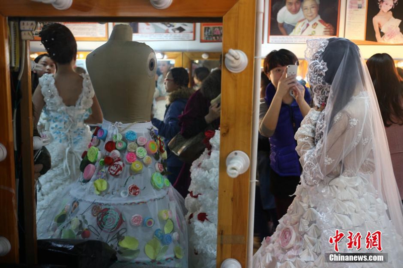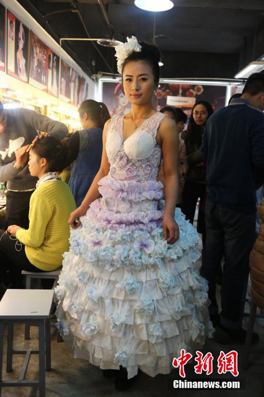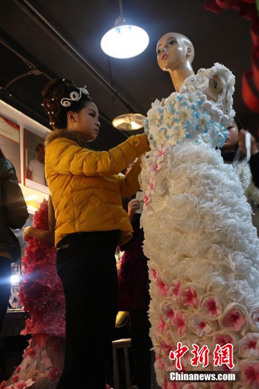 1月12日,成都職業(yè)技術(shù)學院數(shù)十名大學生將自己設(shè)計的期末作品——紙婚紗穿上展示,這些作品都是經(jīng)過數(shù)天時間手工制作而成,以報紙、衛(wèi)生紙、成績單等作為原材料,大學生在完成個性化的婚紗定制的同時還倡行了廢物利用的環(huán)保理念。圖為大學生穿上自己的紙婚紗作品。 張浪 攝