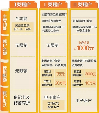 簡單說,Ⅰ類賬戶是全功能賬戶,常見的借記卡就屬于Ⅰ類賬戶;Ⅱ、Ⅲ類賬戶則是虛擬的電子賬戶,是在已有Ⅰ類賬戶基礎(chǔ)上增設(shè)的兩類功能逐級遞減,資金風(fēng)險(xiǎn)也逐級遞減的賬戶。主要區(qū)別如下表: