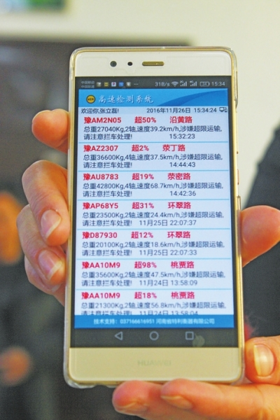 超載信息通過監(jiān)控裝置實(shí)時傳輸?shù)街登诮痪氖謾C(jī)中。